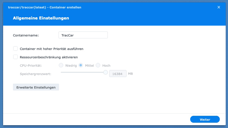 diesem einen Containernamen und klickt auf erweiterte Einstellungen. Dort sind unter